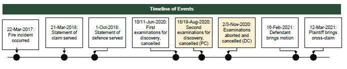 This action arose from a fire incident on the plaintiffs’ property in Waterford, Ontario on or about March 22, 2017, and the defendant’s denial of coverage under a fire insurance policy. The defendant alleged that the denial was because their investigation led them to believe that the plaintiffs had misrepresented the insured risk (they had not disclosed a fire loss in August 2012). The plaintiffs served the Statement of Claim on March 21, 2018, and the defendant responded on October 1, 2018 with a Statement of Defence.